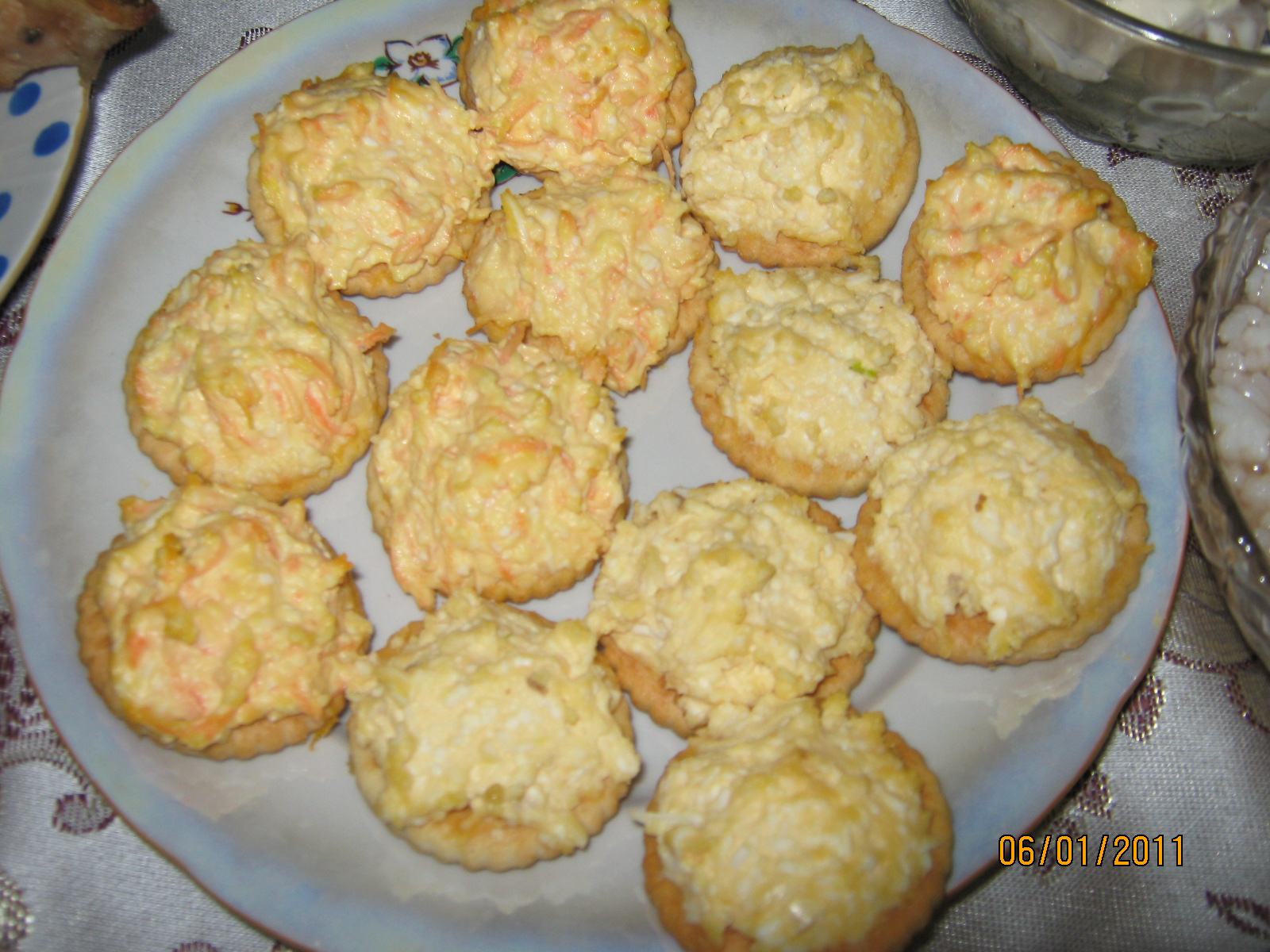 Плавленный сырок на тереть на мелкой терке и смешать с тертыми яйцами морковкой и чесноком. Заправить все майонезом и перемешать.